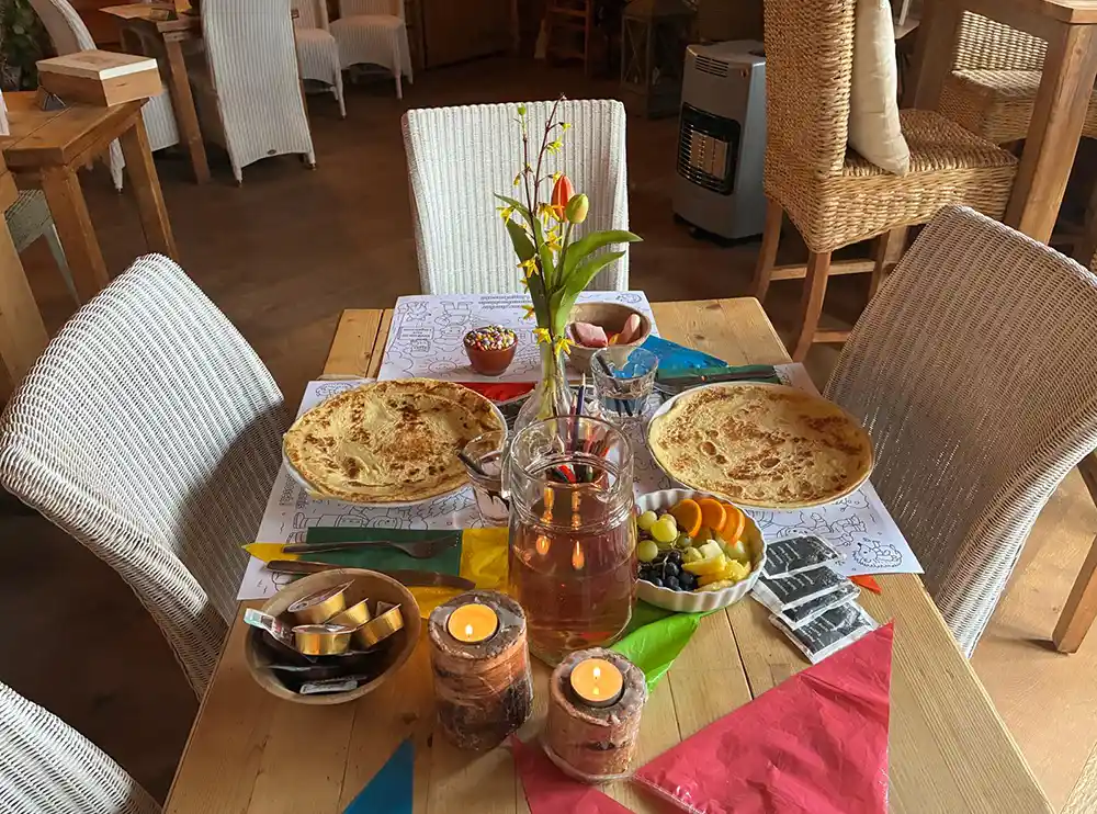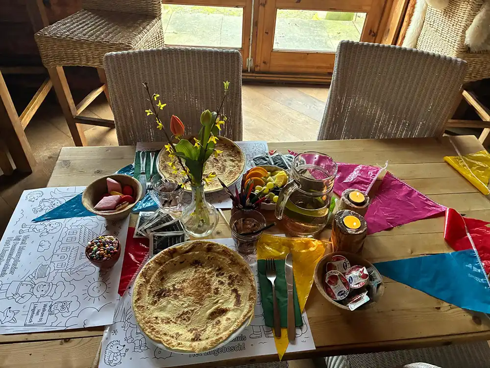 Bij binnenkomst staat er meteen een karaf ranja klaar (1 karaf per 4 kinderen), zodat iedereen gezellig kan proosten op een leuke middag. Op tafel liggen kleurplaten klaar om aan de slag te gaan terwijl iedereen binnenkomt.